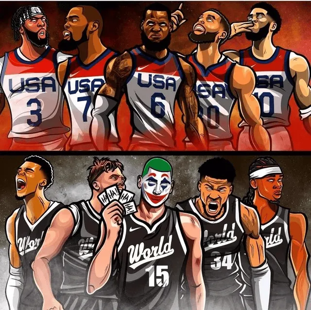圖中美國隊有戴維斯、應該杜蘭特、全明詹姆斯、板字庫里和塔圖姆;