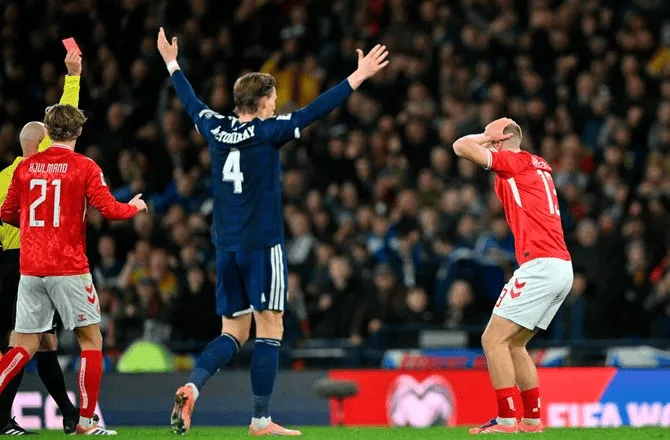虎撲11月19日訊 在丹麥隊與蘇格蘭隊的這場關鍵預選賽中,拉斯穆斯-尼森-克里斯滕森早早被紅牌罰下,丹麥隊最終以2-4落敗。