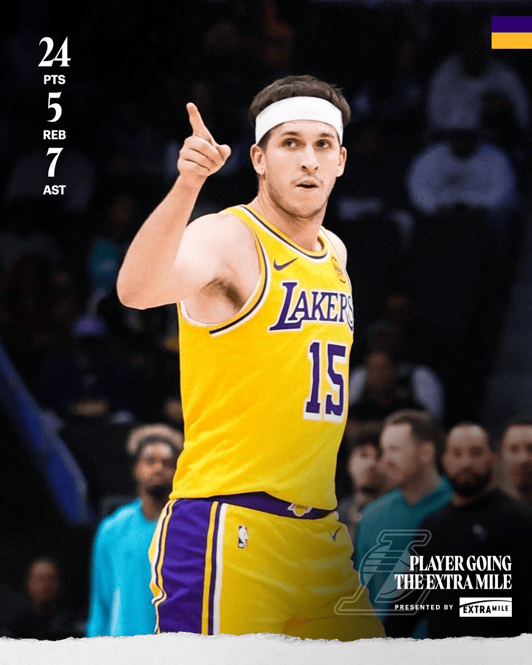 湖人球員奧斯汀-里夫斯全場出戰29分鐘,17投7中,三分10中2、罰球11中8得到24分5籃板7助攻2搶斷。