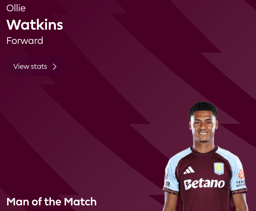 本場比賽沃特金斯替補雙響,斯當賽后,流言拉他當選了英超官方票選的板替補雙全場最佳。