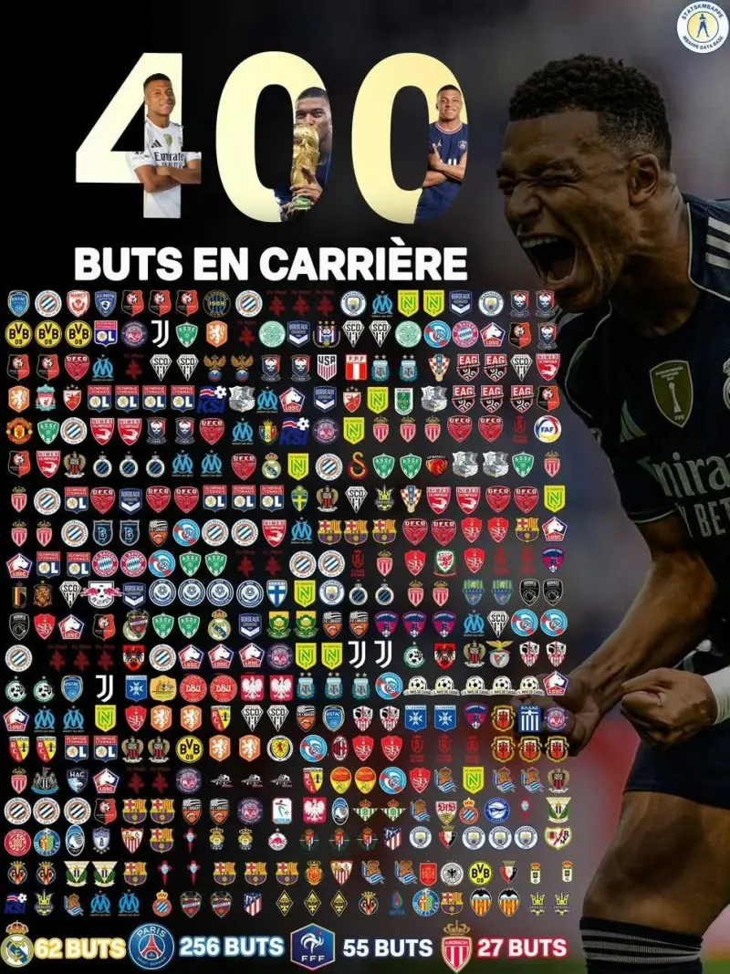 姆巴佩成為21世紀最年輕達到400個職業生涯進球的球員