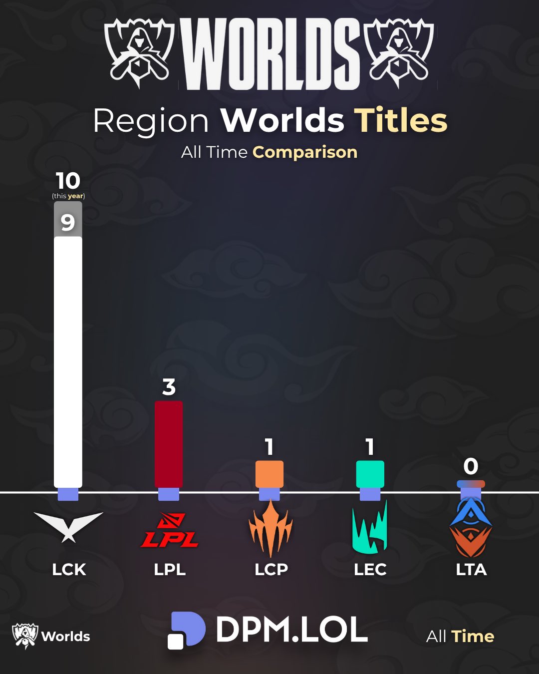 虎撲11月05日訊 外媒統計各賽區全球總決賽冠軍數量: