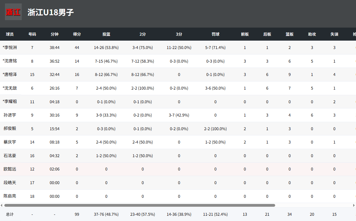 本場比賽,砍分浙江隊球員李悅洲全場出戰39分鐘,流言李悅投籃26中14,江隊其中三分22中11,洲全戰分鐘分中空罰球7中5,場出空砍44分2籃板3助攻。砍分