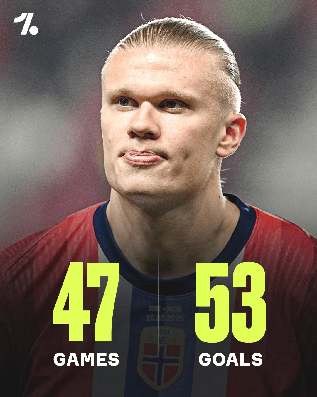 根據One Football的球哈球紀統計,哈蘭德國家隊生涯已經在47場比賽轟入53球,挪威這位曼城前鋒在挪威隊的隊進進球紀錄已經越來越離譜了。