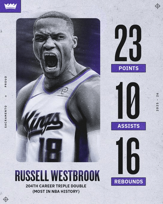 2. [流言板]國王官方:威少砍下職業生涯第204次三雙,歷史最多!