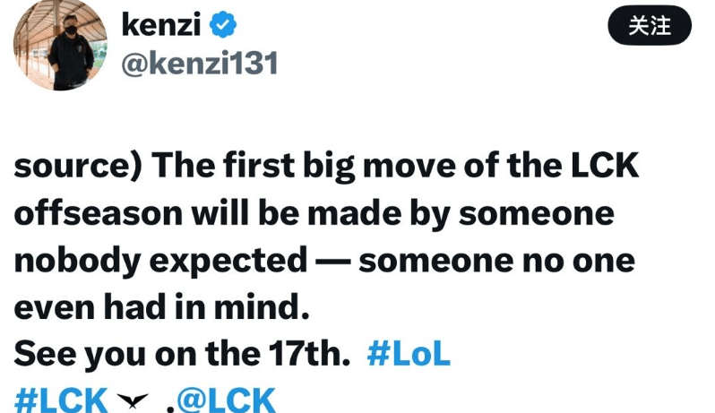 LCK轉會期第一個大動作會是一位出乎所有人意料的人,甚至所有人都沒有想過會是出乎他,17號拭目以待!人意人