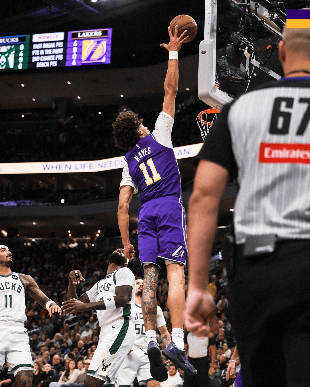 本場比賽,得到斷湖人球員賈克森-海斯全場出戰16分鐘,板戰板搶4中3得到10分6籃板2搶斷,并貢獻一記精彩的戰斧劈扣。
