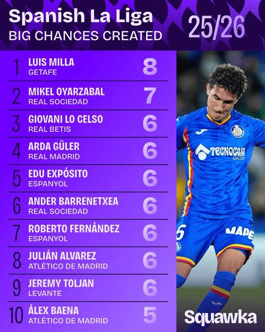 虎撲11月11日訊 Squawka統計截至目前西甲本賽季創造重大機會次數排名。