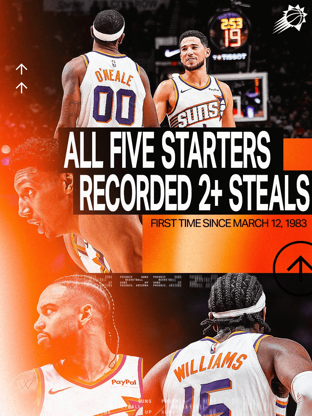 太陽官方分享數據:本場首發五人全部送出2+搶斷,球隊自1983年至今首次做到,也是隊史第10次做到。