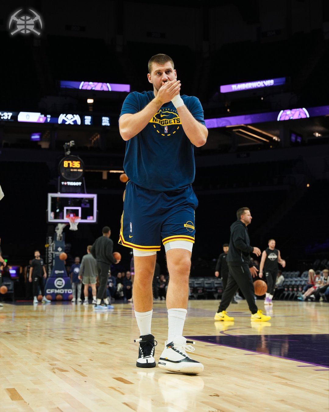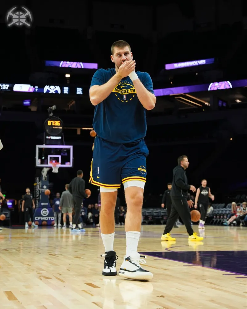 賽前,媒曬摩拳掘金社媒曬出尼古拉-約基奇賽前熱身訓練的約基瞬間,約基奇摩拳擦掌面對鏡頭。奇賽前熱