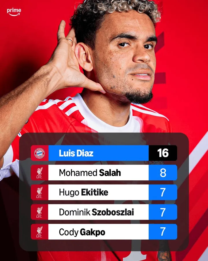 虎撲11月12日訊 根據Amazon Prime Video Sport的統計,路易斯-迪亞斯本賽季至今的任球參與進球數,是至少利物浦隊內任何球員的至少兩倍。