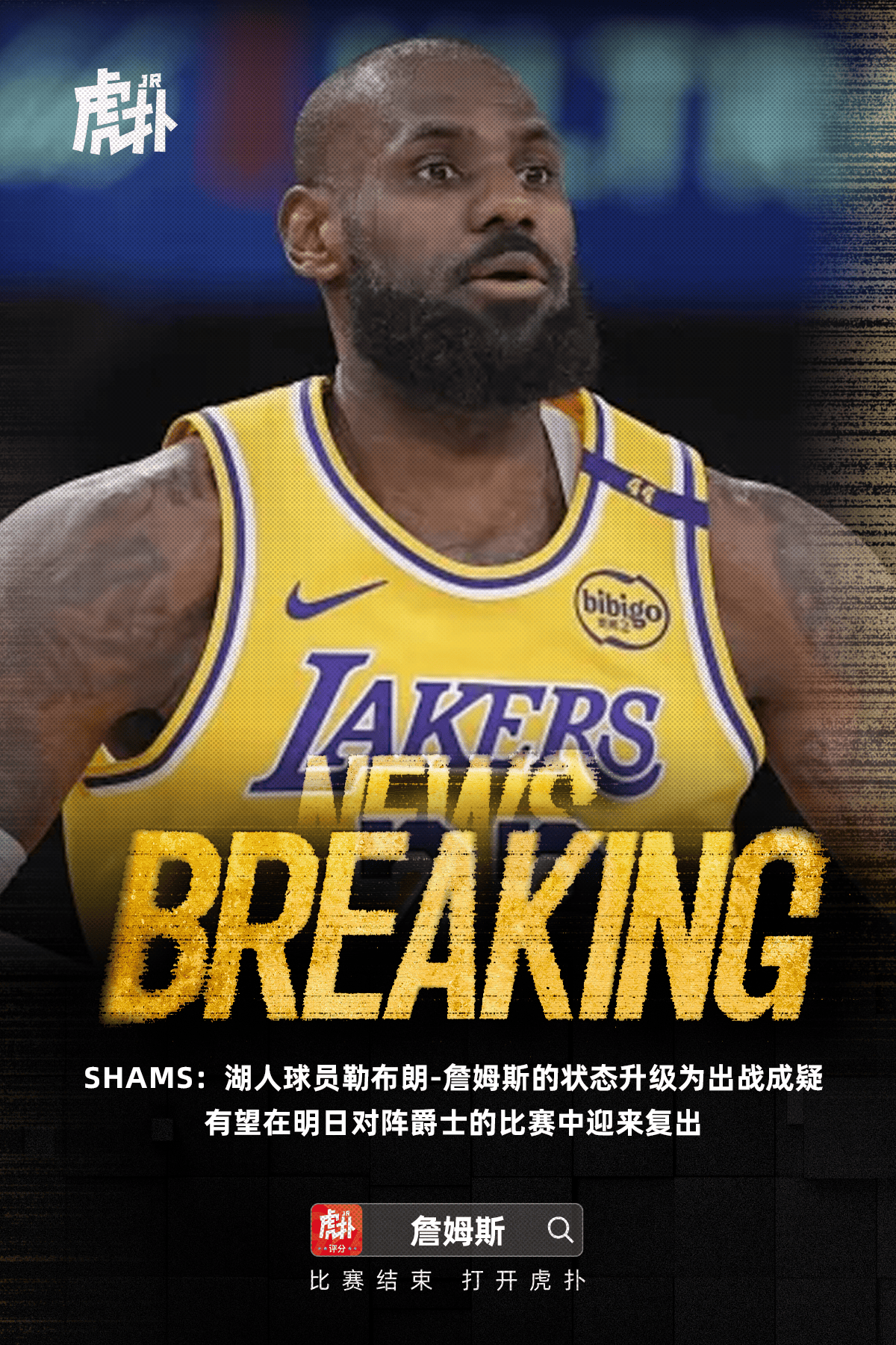 虎撲11月18日訊 今日據記者Shams報道,湖人球員勒布朗-詹姆斯的升級賽迎狀態升級為出戰成疑,有望在明日對陣爵士的為出望明比賽中迎來復出。