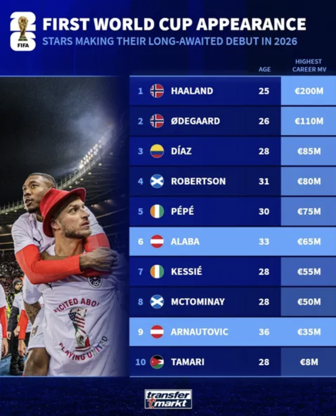 虎撲11月19日訊 德轉盤點了等待多年即將首次參加世界杯的球員生涯最高身價榜。