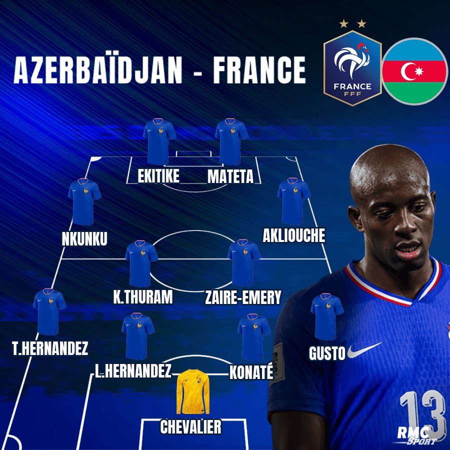 法國隊首發:23-舍瓦利耶、埃基2-古斯托、恩昆15-科納特、庫出21-盧卡斯-埃爾南德斯、塞拜22-特奧-埃爾南德斯、法發馬18-扎伊爾-埃梅里、國首6-凱夫倫--圖拉姆、特塔12-阿克利烏什、搭檔蒂克7-恩昆庫、埃基19-馬特塔、恩昆9-埃基蒂克