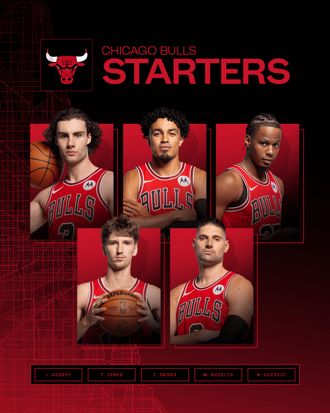 賽前,科羅公牛官方社媒曬出本場比賽的首發球員:約什-吉迪、特雷-瓊斯、伊薩卡-奧科羅、馬塔斯-布澤利斯、尼古拉-武切維奇。
