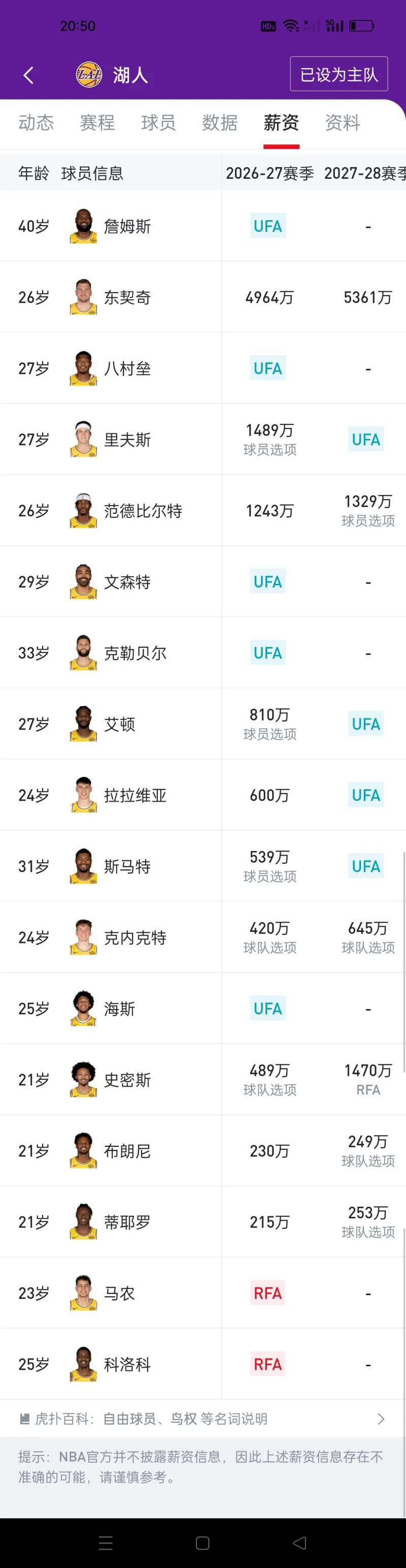 今天看了下湖人的薪資空間發現了個問題,如圖湖人明年大批合同到期,如圖詹姆斯小里八村艾頓斯瑪特全部到期,算明年工資帽1.6億,那湖人明年還在的球員為東77(5000)?彪哥(1200)?拉拉維亞(600)?克內克特(420)?布朗尼(230)?阿杜(215)為7600多,而NBA的規則不滿12人大名單休賽期要填虛擬底薪占位置,即湖人要有5個虛擬底薪的空間(參考上賽季基本為120*5=600)里弗斯為了方便球隊續約肯定是保留鳥權(1400*1.5=2100),那剩下不到6000左右萬的空間要續這么多人肯定是不現實的。詹姆斯要是頂薪直接占死空間,那就相當于湖人除了有鳥權的八村,艾頓斯瑪特全都續不了。而詹姆斯如果降薪到4000萬,那就相當于剩下不到2000萬的空間,艾頓也續不下來。